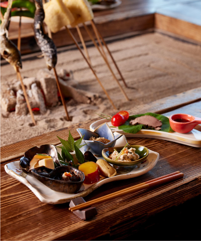 菊日和の料理は、恵那産のその季節ごとの旬な食材を使っております。夏には新鮮な鮎や岩魚、秋には栗を使った料理など、その時々でお客様に楽しんで頂けるような料理を考えております。囲炉裏を囲みながらゆっくりと焼き上がっていく料理を、心置きなくご堪能ください。